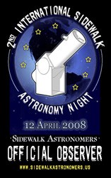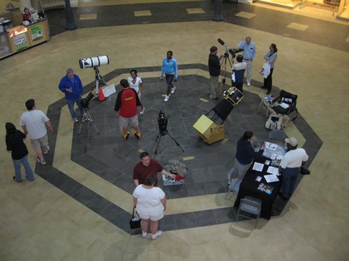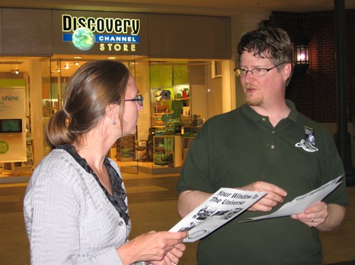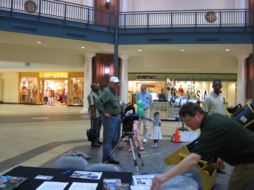 The first ever International Sidewalk Astronomy Night took place on May 19, 2007. We were at Bayshore Town Center, originally set up along the sidewalk just to the north of Kay Jewelers (across the street from Alterra Coffee). Unfortunately, the skies were overcast and it was raining off and on throughout the night, forcing us to move our setup indoors. Still, about 50 people joined us for a night of wonder, looking through telescopes at distant objects inside the mall, and talking about astronomy. It was a worthwhile event and we’ll be back at Bayshore, so check this website often!